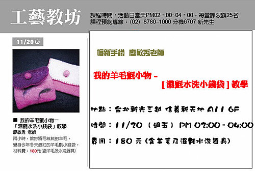 費用:180 元 (含羊毛及濕氈水洗器具)